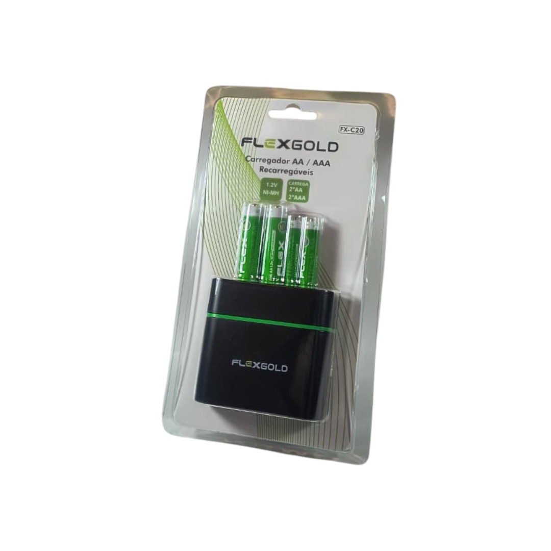 O carregador Flexgold FX-C20 foi desenvolvido para recarregar pilhas recarregáveis dos tipos AA e AAA de forma rápida, segura e eficiente. Compatível com pilhas Ni-MH (Níquel-Metal Hidreto) de 1.2V, o modelo conta com 4 canais de carga independentes, permitindo o carregamento simultâneo de diferentes combinações: de 1 a 2 pilhas AA e/ou 1 a 2 pilhas AAA.